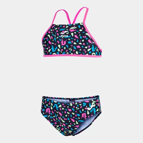 Conjunto de top y braguita. El top de tirantes tiene la espalda descubierta y la braguita es de corte clásico. Ambos incorporan forro interior y han sido confeccionados en tejido elástico de baño.