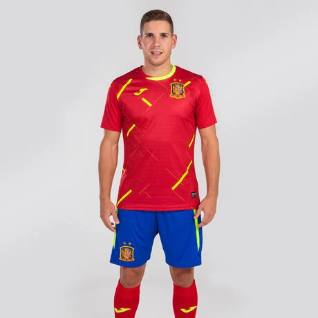Su diseño representa los colores propios del país, rojo y amarillo, con la novedad de incluir el amarillo en un tono flúor. Esta característica le aporta modernidad a la prenda y mayor estilo deportivo. Cuenta también con la etiqueta de producto oficial situada en la parte inferior derecha de la prenda. Como novedad, la prenda incluye una sublimación geométrica en la parte delantera en amarillo flúor.