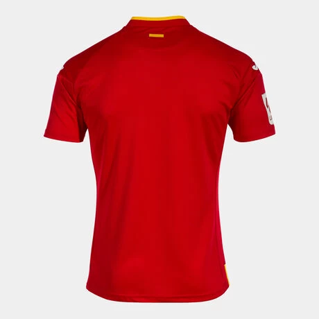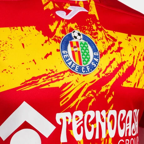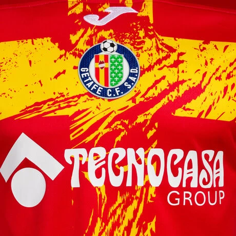 Segunda camiseta del Getafe CF de la temporada 2023/2024, modelo de hombre. La camiseta de la segunda equipación continúa con el rojo, color que ya es usual en el uniforme de visitante del Getafe CF. El diseño homenajea al Cerro de los Ángeles de Getafe. La cruz sublimada de la parte frontal simboliza este lugar, centro geográfico de la península ibérica. Aparece en amarillo que, junto con el rojo, dan lugar a los colores nacionales.