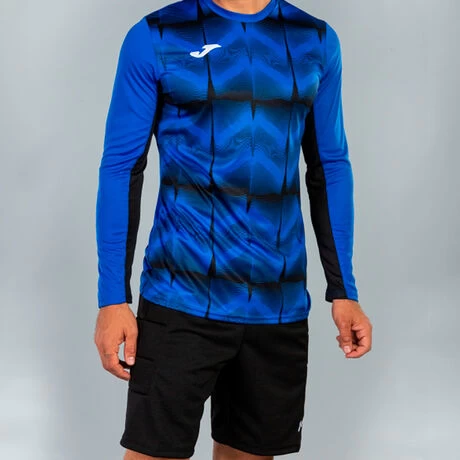 Camiseta específica para portero, de manga larga y cuello redondo. Se caracteriza por su llamativo estampado realizado en sublimación. En la parte inferior de las mangas se introduce una pieza de tejido Mesh que favorece la transpiración. Logotipo bordado.