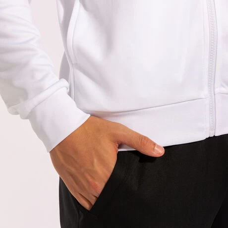 La chaqueta cuenta con cierre completo de cremallera, cuello alto para proteger la zona del frío y con amplios bolsillos sin cremallera para guardar pequeños objetos. También incluye rib en los puños y en el bajo que proporcionan un ajuste cómodo sin limitar el movimiento. En cuanto a su diseño, incorpora cortes de contraste a color en el frontal, que añaden un toque extra de estilo a la sudadera