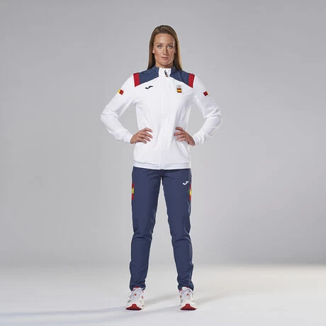 Las cremalleras incluyen la bandera de España. Incorpora “ESPAÑA” en la parte superior de la espalda y la bandera de España en las mangas. Incluye logotipo Joma y escudo del COE bordados en el pecho.