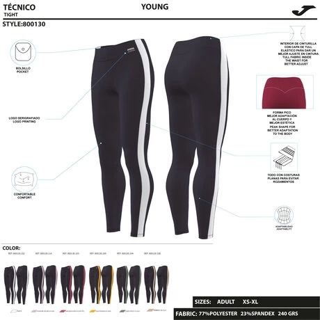 Mallas largas de mujer. Estos leggings incorporan cintura elástica con capa de tull y forma de pico en la parte trasera para conseguir un ajuste óptimo. Además, incluyen un pequeño bolsillo interior en la parte superior trasera. Están fabricados con tejido elástico rematado con el sistema de costuras planas flatlock, que previene las rozaduras. Así, la deportista podrá disfrutar del máximo confort y libertad de movimientos.