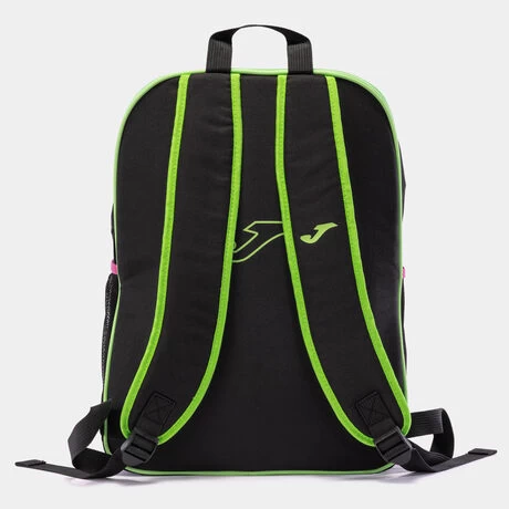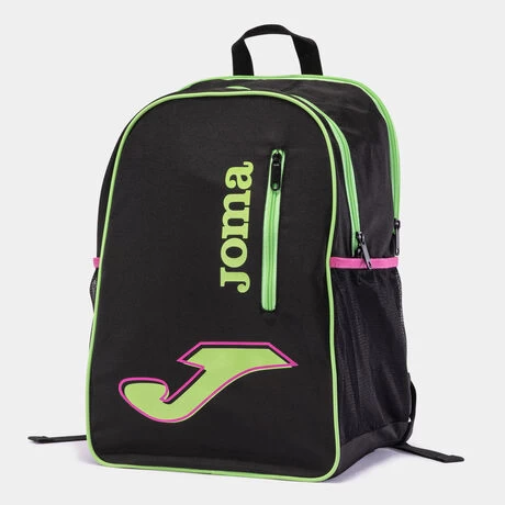 Mochila con bolsillo principal, bolsillo en el frontal pequeño con cremallera, bolsillos de rejilla en los laterales y bolsillo trasero específico para guardar la raqueta. El interior es acolchado e incluye un bolsillo con vivo elástico. Cuenta con correas acolchadas y ajustables.