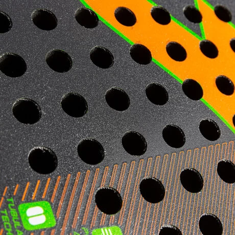 La capa externa está fabricada en fibra de vidrio. Los filamentos de vidrio crean una pala muy cómoda para el jugador, menor rigidez en el golpeo y buena flexibilidad. El núcleo interior está construido con la tecnología EVA SOFT. La densidad de este material hace que ganes en potencia en cada golpe. La terminación arena consigue mejores efectos en cada uno de los golpes.