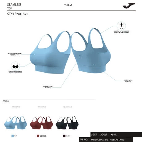 Este sujetador deportivo incorpora, por un lado, tirantes anchos y cuello redondo para ofrecer mejor libertad de movimientos. No tiene apenas costuras. Su diseño seamless proporciona un confort inigualable.