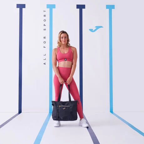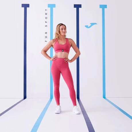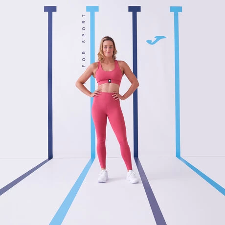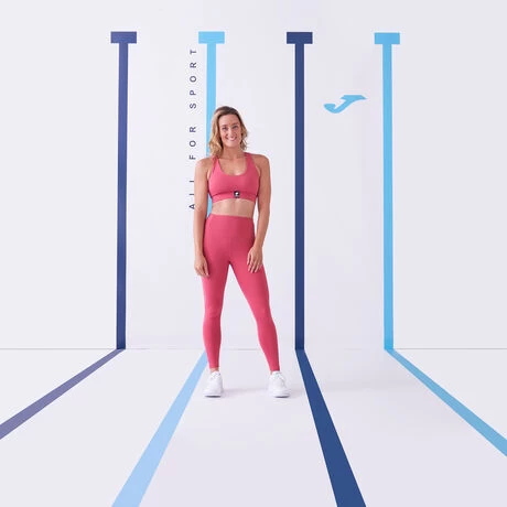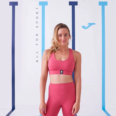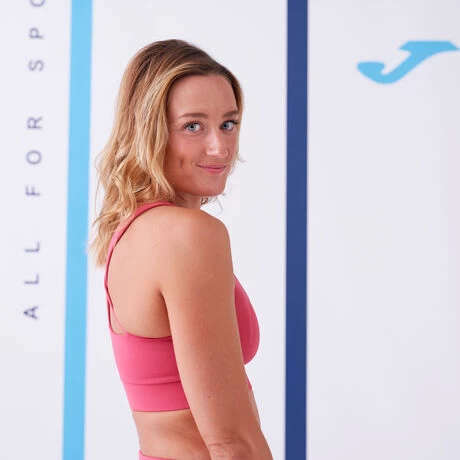Sujetador deportivo de mujer. Está confeccionado en tejido transpirable y elástico, que se adapta al cuerpo de la deportista y le proporciona confort. Además, no se trasparenta. Este top presenta una sujeción al pecho media.